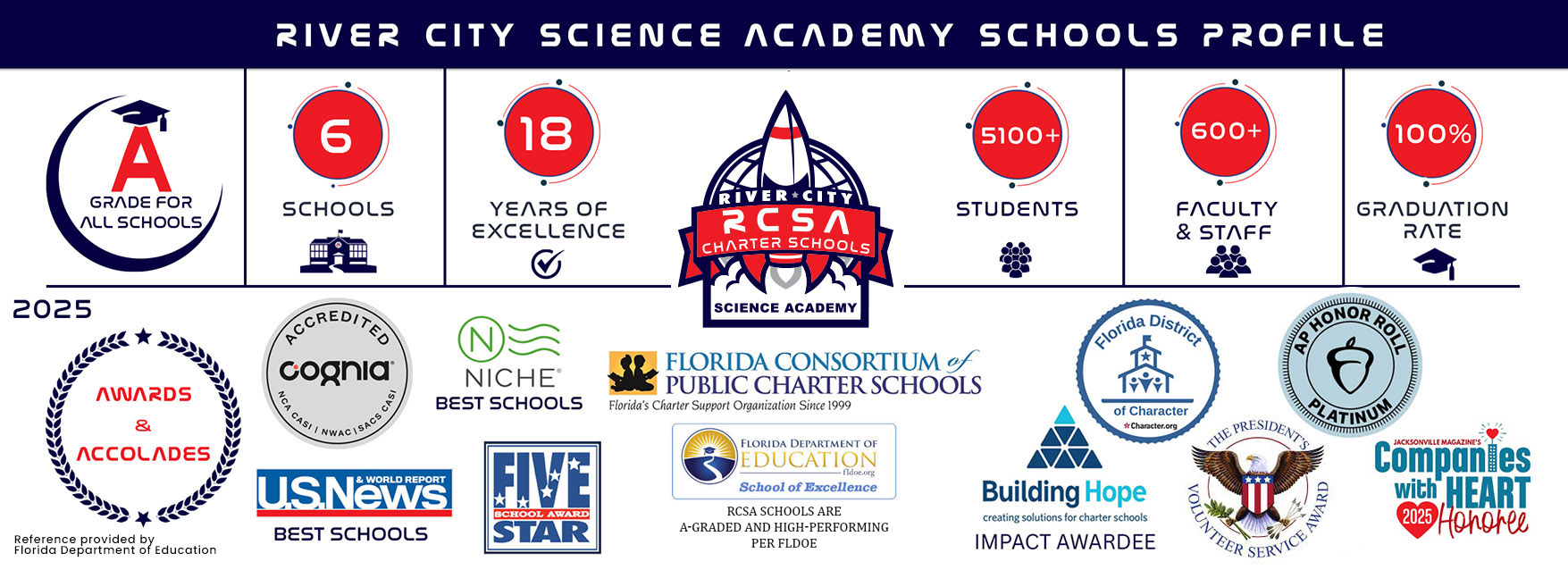RCSA continues to provide strong academics to prepare college-bound students in addition to exciting before and after school programs. RCSA is recognized as a high performing charter school by the Florida Department of Education (FLDOE) and was the first charter school in Duval County to earn an A grade. Since its beginning, RCSA has worked to adapt to current educational trends by becoming increasingly data-driven, standards-based and financially secure, without losing sight of its innovative vision of the learning process.